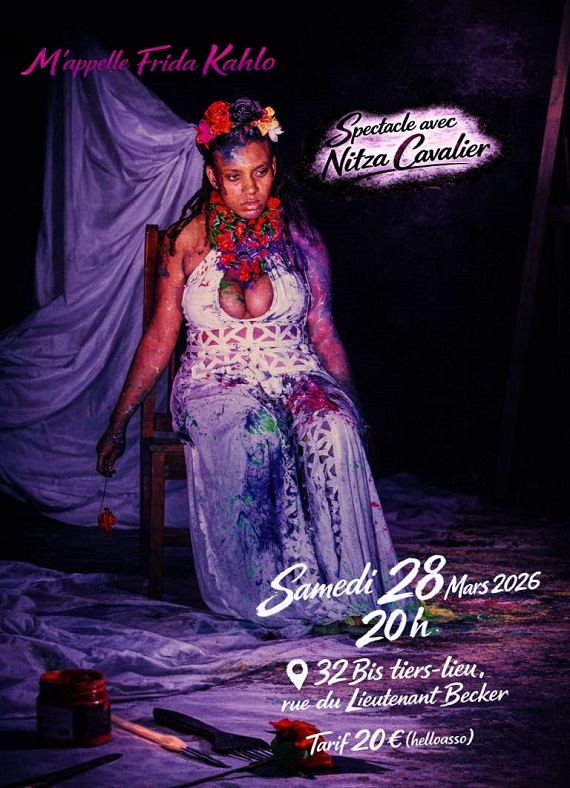Cher public, avec une émotion profonde, je vous annonce que 《M’appelle Frida Kahlo》 est désormais un spectacle complet. Je vous invite donc à la grande première prévue le 28 mars 2026 prochain, à 20 h, au 32 BIS/CAYENNE.