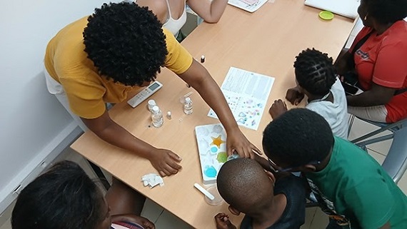 Dans la salle d’activité de CapParents, sur la route de la Madeleine à Cayenne, chaque tête d’enfant qui passe par la porte est accueillie à grands cris. « Kelviiiin ! », « Johnnyyyy ! » Tout à la fabrication de savons en forme de poissons et d’étoiles de mer, Angelo, 7 ans, annonce l’arrivée de chaque nouvel enfant. Accompagnés de leurs mamans, toutes en situation de handicap, ils viennent participer à un atelier dans le cadre du dispositif CapParents, confié par l’Agence régionale de santé au groupe SOS Solidarités.