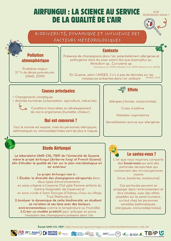 Dans le cadre du projet, Atmo Guyane mesure la qualité de l’air sur le plan environnemental. En parallèle, les chercheurs de l’Université de Guyane récoltent les champignons aériens pour identifier et cartographier leur présence. En croisant ces données avec celles d’Atmo Guyane et de Météo France, ils analysent la diversité et l’évolution de ces champignons en fonction des conditions climatiques et environnementales.