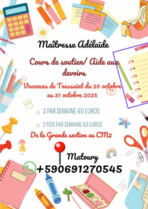Professionnel de l'éducation, formation donne cours MATHS et FRANCAIS en individuel et en petit groupe du CE2 à la 3° à Matoury (bourg, concorde, cogneau, barbadines, guimanmin, copaya...) pédagogie différenciée.